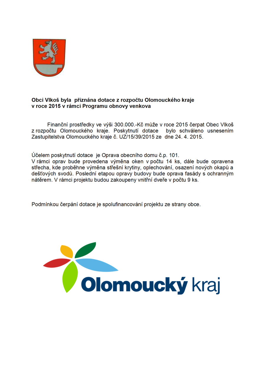 Úvod > Obecní úřad > Dotace a příspěvky > Dotace z rozpočtu Olomouckého kraje POV 2015